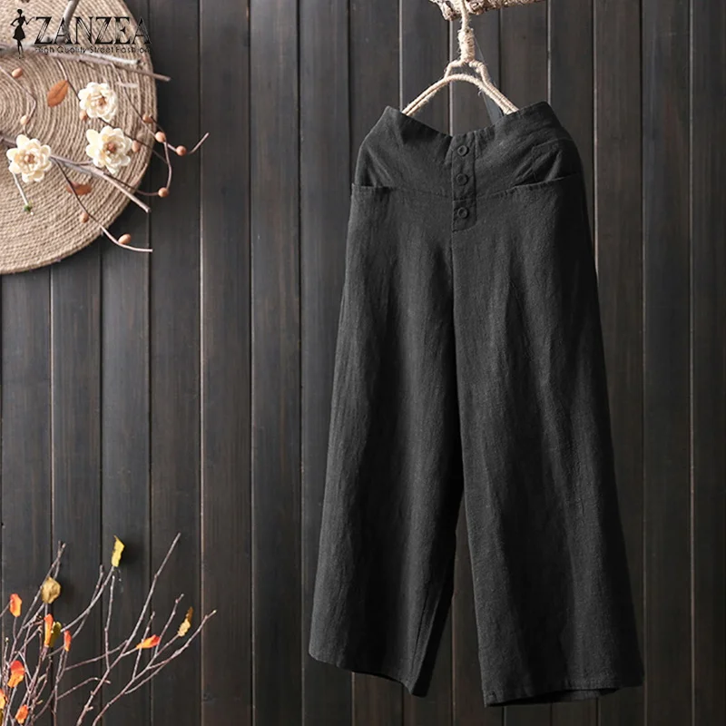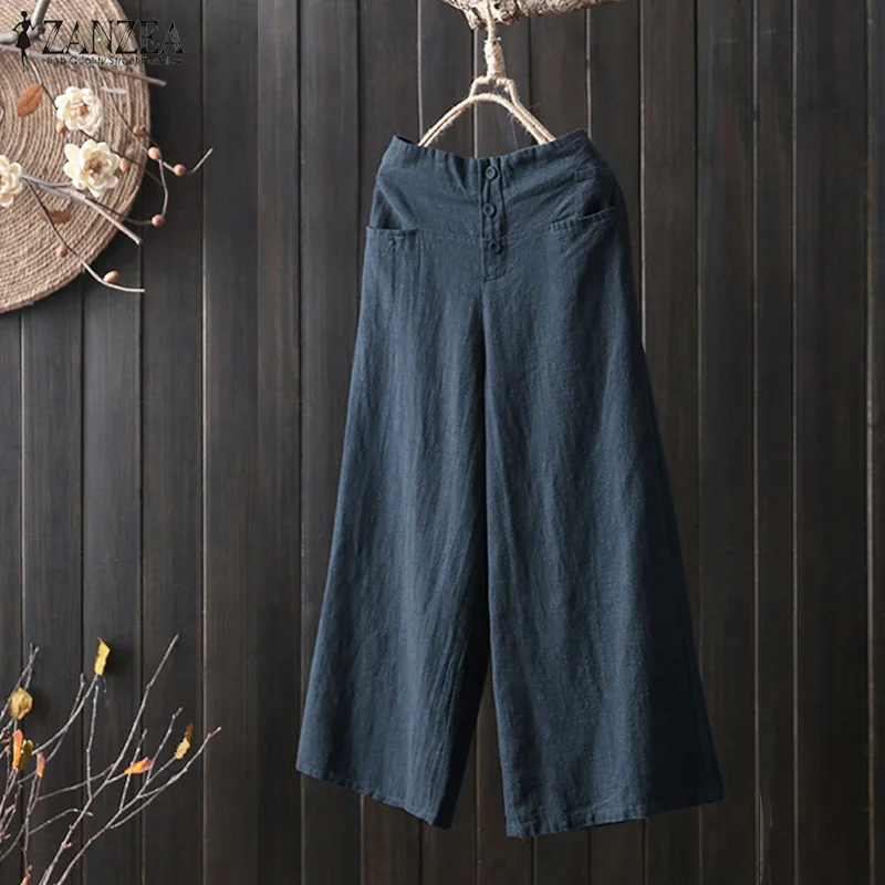 SALE ZANZEA Women Vintage Solid Butons Trousers Elastic Waist Wide Leg Pants Casual Loose Pockets Pantal